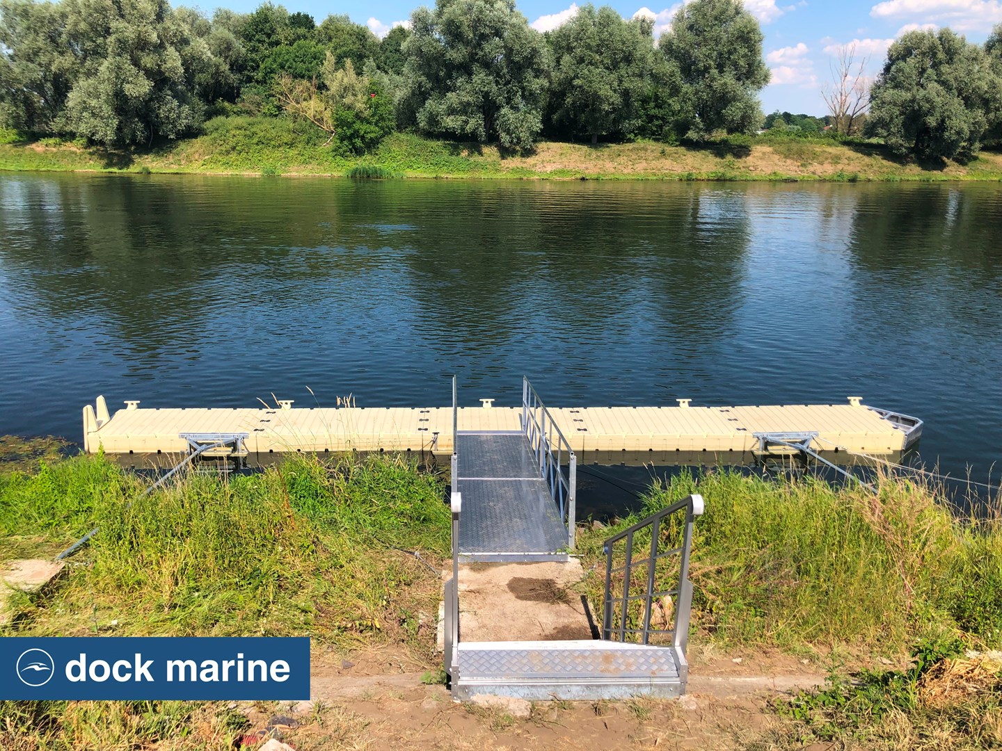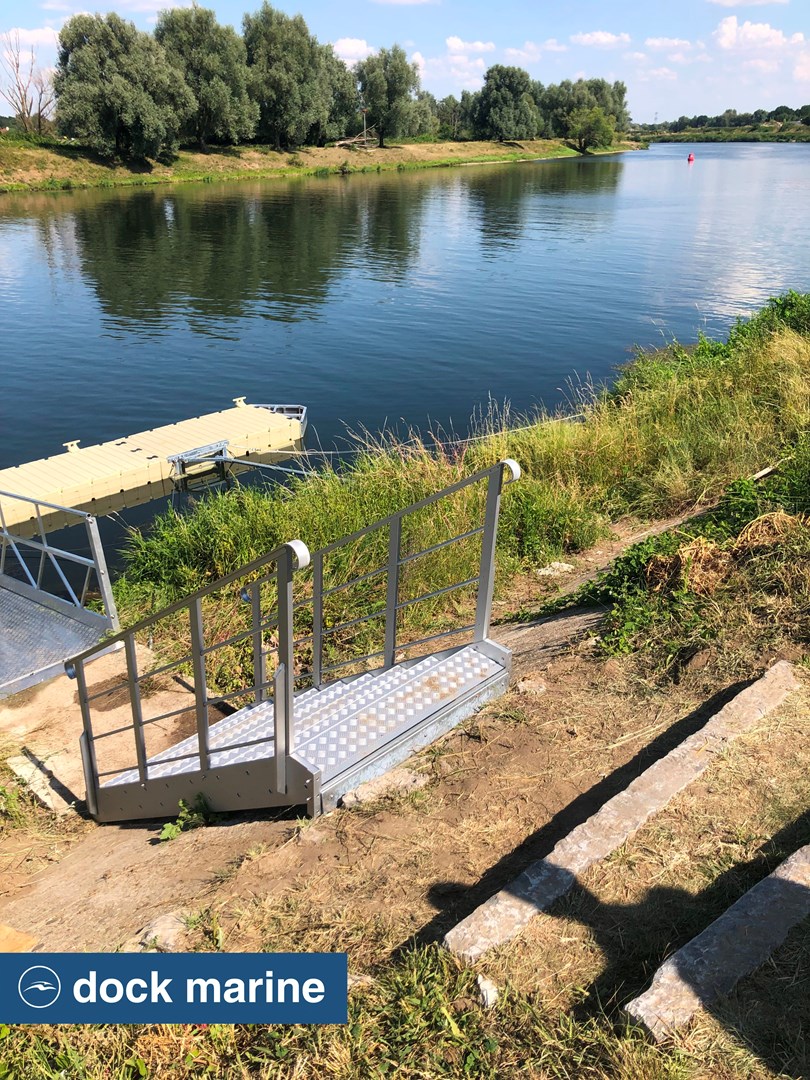 L'accès au ponton est facilité par une passerelle en aluminium de 6 mètres, couplée à un escalier sécurisé. L’ensemble est solidement ancré par deux bracons, garantissant à la fois la stabilité de la structure et une liberté de mouvement adaptée aux variations du niveau d’eau.