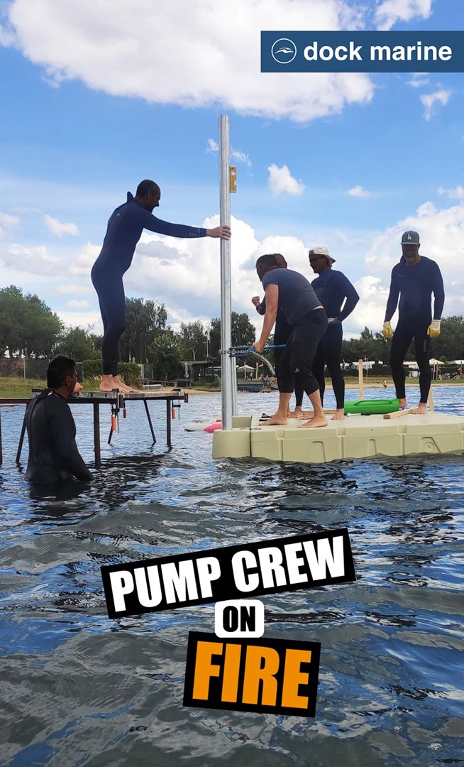 Livraison d’une section RotoDock 2x3 m, ancrée par deux pieux de 3 m, pour créer un ponton de départ dédié au pumping foil, aussi appelé dockstart.